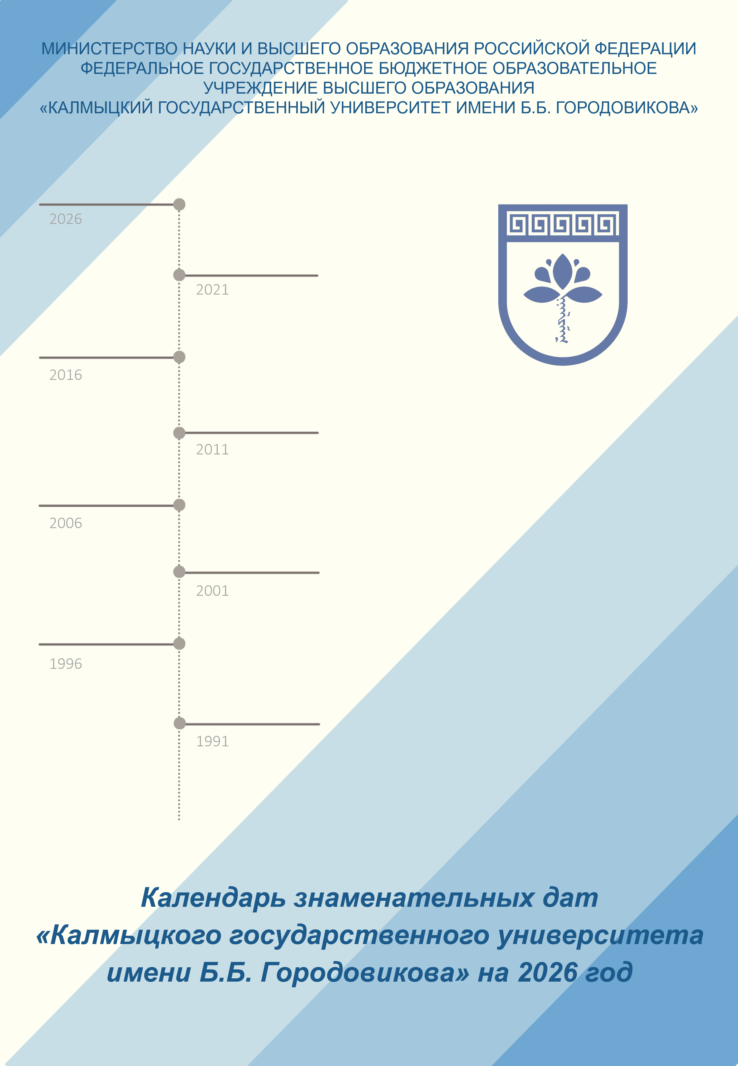 В календаре знаменательных дат Калмыцкого государственного университета имени Б.Б. Городовикова на 2026 год представлены материалы о юбилейных, памятных, знаменательных датах и событиях в истории университета.