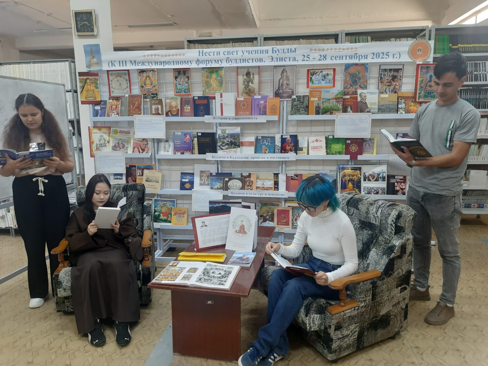 В преддверии III Международного буддийского форума «Буддийский мир в новом тысячелетии» в читальном зале краеведческой литературы научной библиотеки КалмГУ оформлена книжно-иллюстративная выставка «Нести свет учения Будды». Выставка состоит из нескольких разделов разных по содержанию. Прежде всего, это большая группа книг о жизни и деятельности Далай-ламы XIV, где раскрывается его роль как выдающегося философа, борца за мир и права человека и которого буддисты почитают как земное воплощение Авалокитешвары.