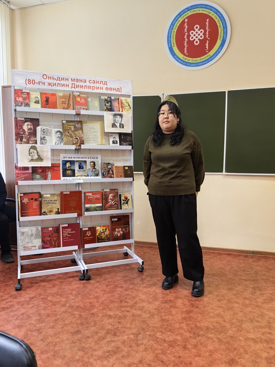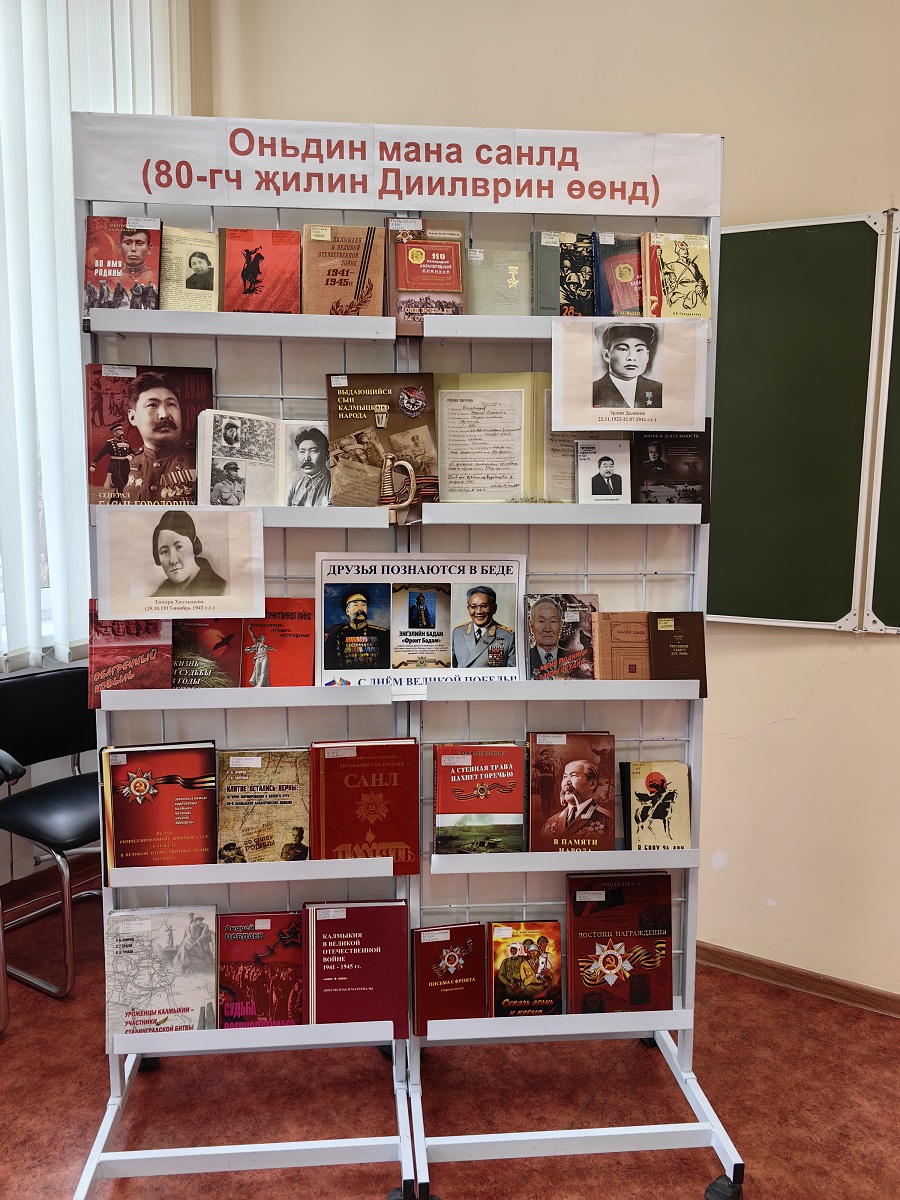 Сотрудники научной библиотеки оформили книжную выставку «Оньдин мана санлд. 80-гч җилин Диилврин өөнд», где были представлены сборники стихов, художественные книги калмыцких писателей, ученых-историков КалмГУ.