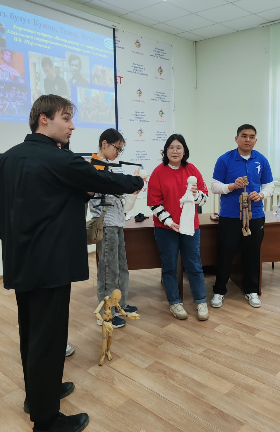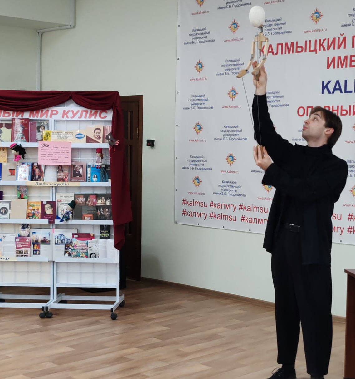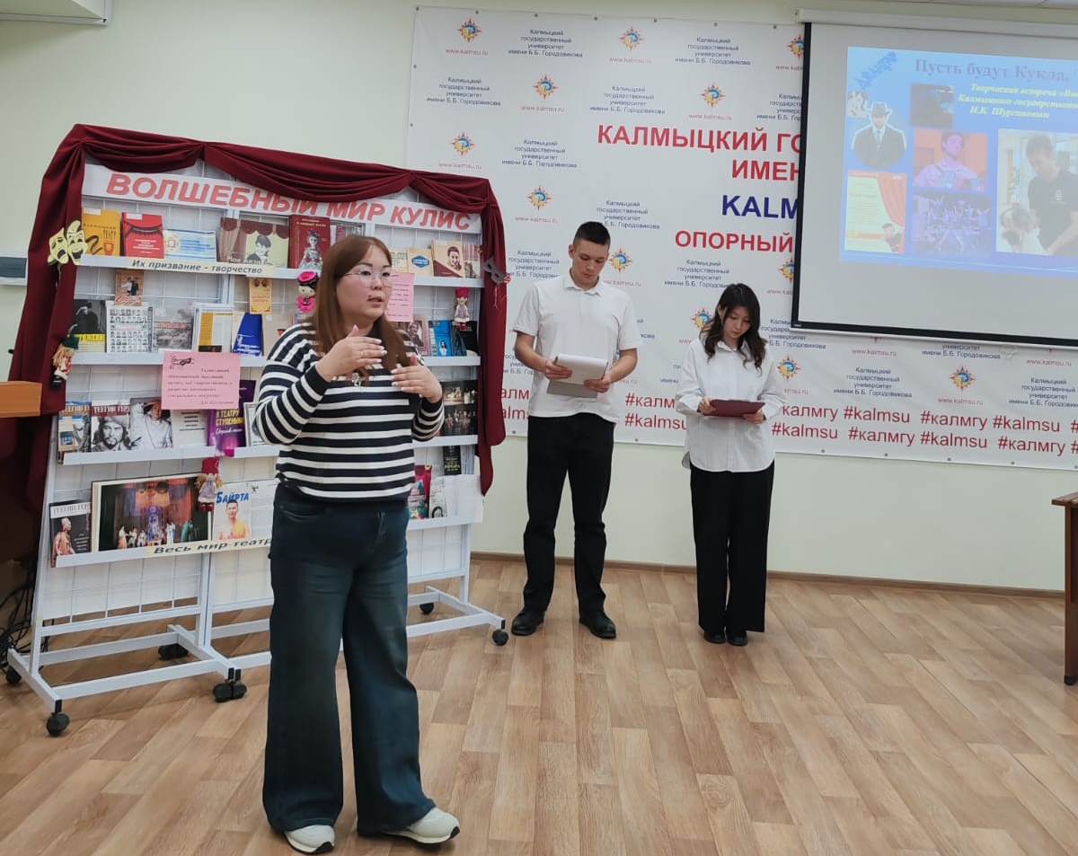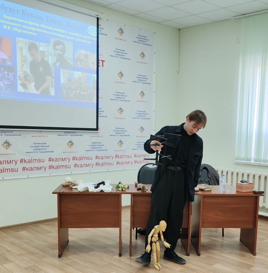 В преддверии профессионального праздника, 25 марта 2025 года сотрудники научной библиотеки КалмГУ провели творческую встречу с актёром-кукловодом Калмыцкого государственного театра кукол «Джангар» Игорем Шургиновым. Мероприятие традиционно началось с истории возникновения театра. Первый театральный сезон в Калмыцком государственном театре кукол открылся в 2021 году.