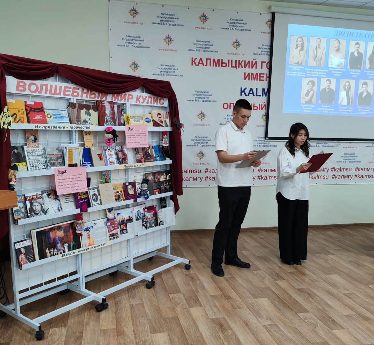 Для того чтобы погрузиться в волшебный мир театра и ощутить его атмосферу сотрудниками отдела обслуживания научной библиотеки была оформлена тематическая книжная выставка «Волшебный мир кулис» и представлена презентация «Виват, театр!», на слайдах которой была размещена информация театра кукол Калмыкии. В ходе творческой встречи прозвучало стихотворение С.Я. Маршака «Театр! Как много значит слово» в замечательном, лирическом исполнении студента 3 курса юридического факультета Владислава Павлова.