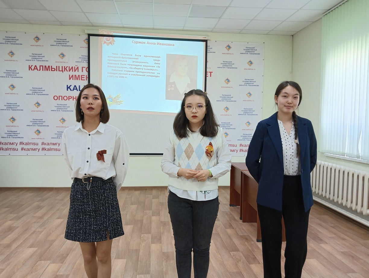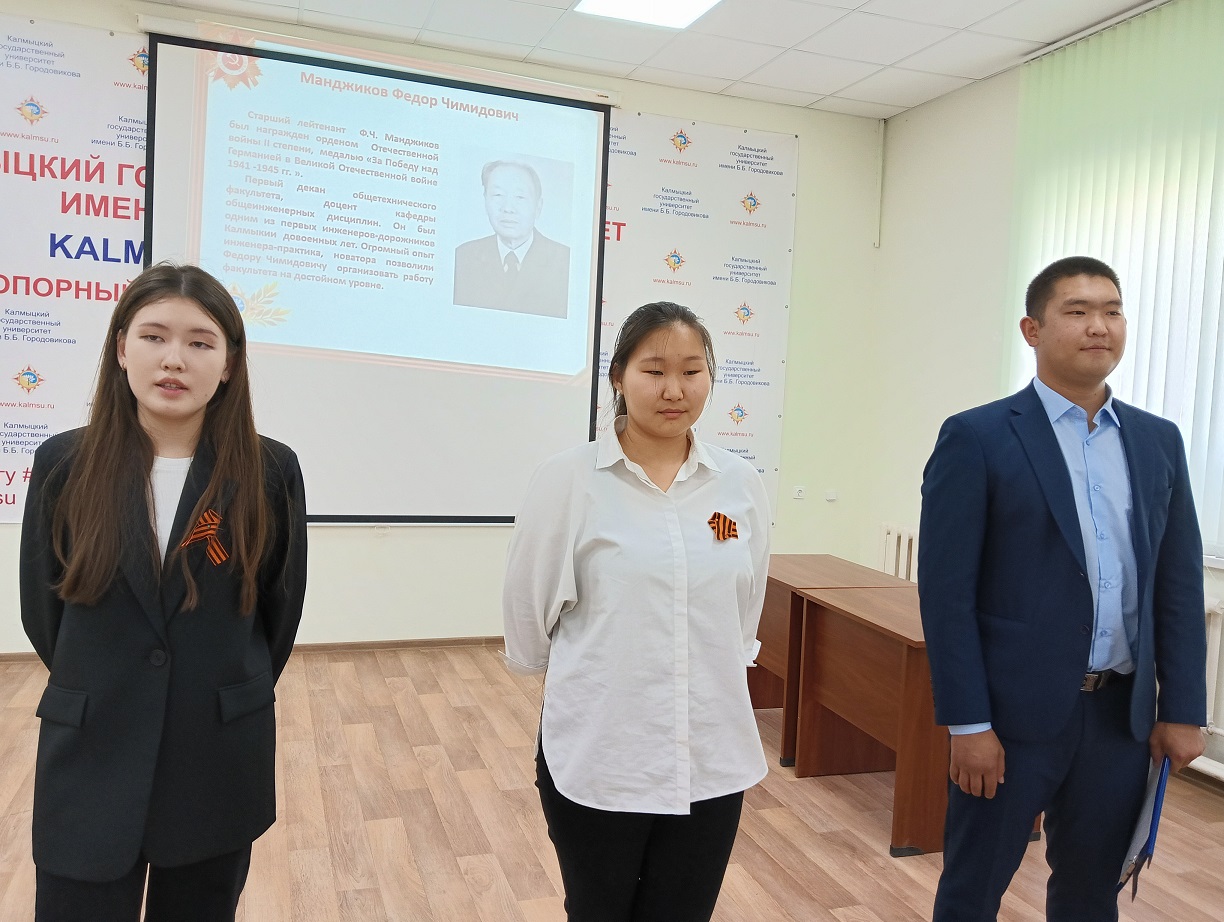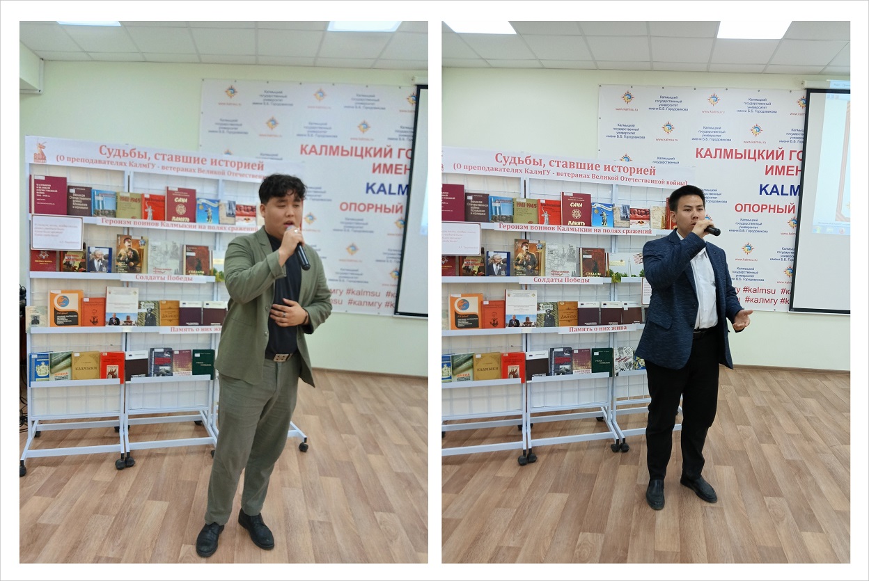На разных дорогах войны ковали общую победу наши преподаватели, но в этот день они словно встали в единый строй – «Научный полк» КалмГУ и незримо находились в зале. Война их пощадила, им посчастливилось сквозь кровь и пот, через огонь и воду, теряя однополчан, получая ранения, выйти из окружения под Брестом, уцелеть в битвах под Сталинградом и Москвой и услышать долгожданный Салют Победы! Им повезло, и они жили, словно за себя и за фронтовых друзей, ставших просто «землей, травой». Их памяти посвятил песню «За себя и за того парня» магистрант ИКФВ Мандеев Наран.