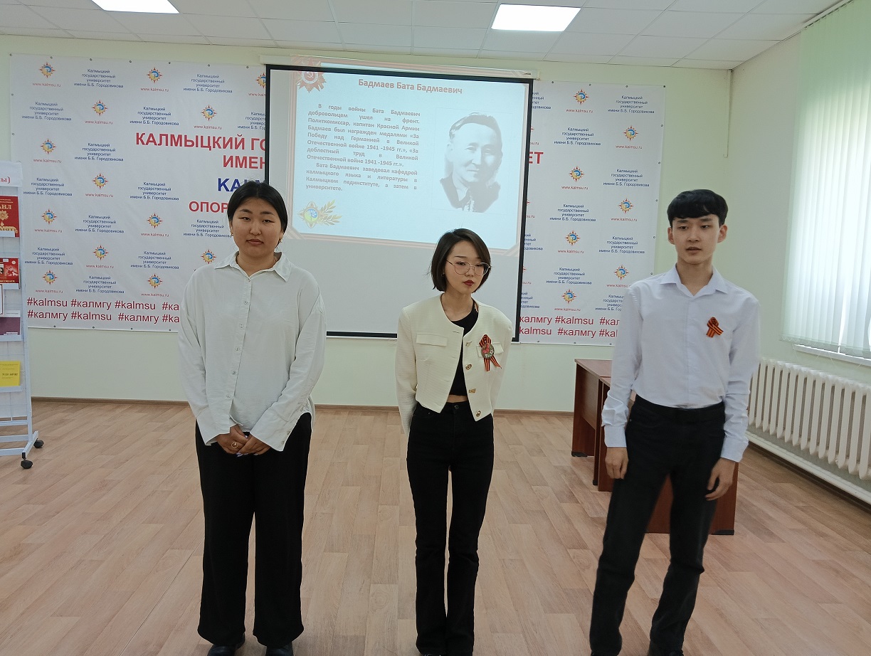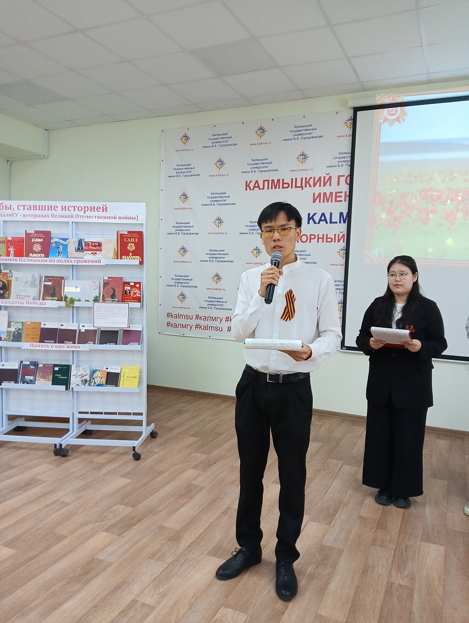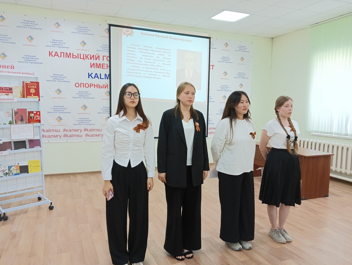На разных дорогах войны ковали общую победу наши преподаватели, но в этот день они словно встали в единый строй – «Научный полк» КалмГУ и незримо находились в зале. Война их пощадила, им посчастливилось сквозь кровь и пот, через огонь и воду, теряя однополчан, получая ранения, выйти из окружения под Брестом, уцелеть в битвах под Сталинградом и Москвой и услышать долгожданный Салют Победы! Им повезло, и они жили, словно за себя и за фронтовых друзей, ставших просто «землей, травой». Их памяти посвятил песню «За себя и за того парня» магистрант ИКФВ Мандеев Наран.