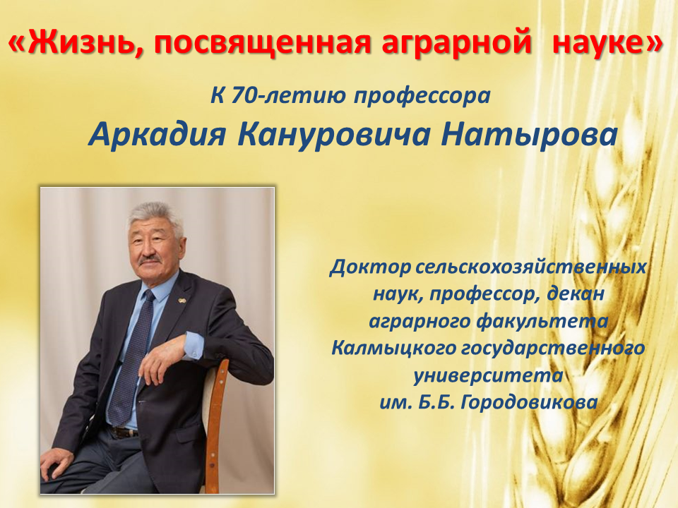 22 октября доктор сельскохозяйственных наук, профессор, декан аграрного факультета КалмГУ Аркадий Канурович Натыров отмечает свой 70-летний юбилей.